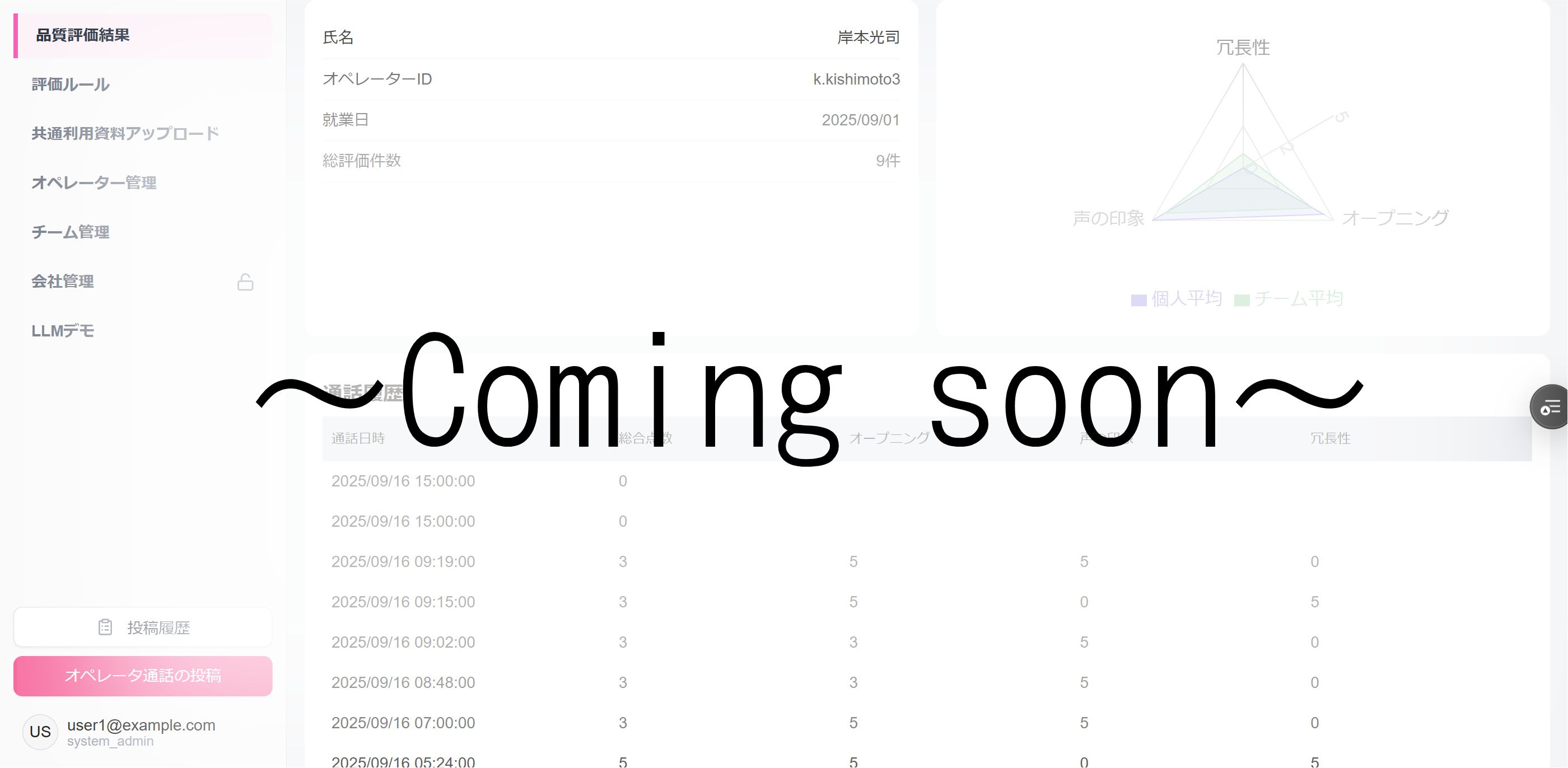 オペレーター個人やチーム全体のスコアを蓄積し、日次・月次での変化を可視化する機能です。